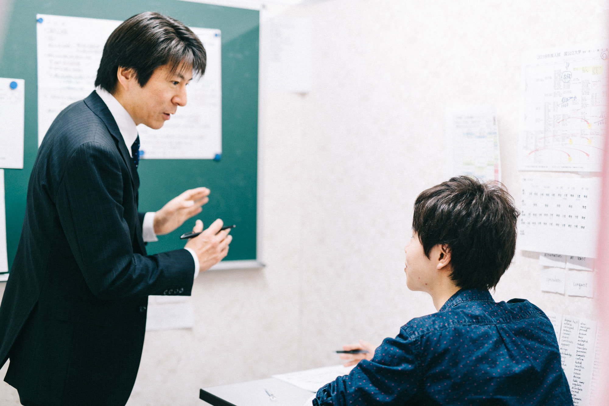 その際、ブラッシュアップシートと呼ばれる紙に板書されるため、生徒はノートを取る必要はなく、講師の言葉に集中し、濃密な学習が行なえます。ブラッシュアップシートは自分専用なので、生徒は壁一面にブラッシュアップシートを貼りだし、何度でもチェックすることで効率よく重要事項の復習が可能です。