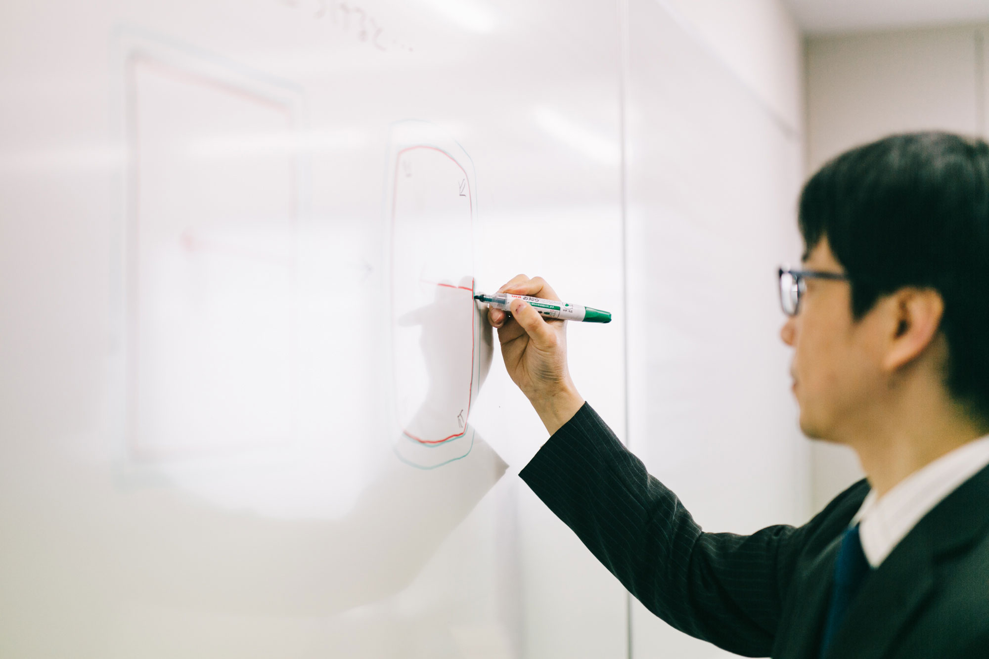 完全1対1個人授業では、講師が個人ブースの中で前に立って黒板を使って『一人のための授業』を行います。