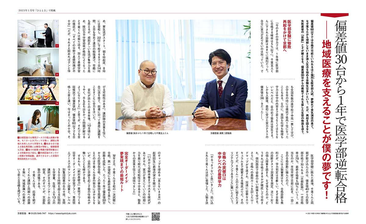 私は入塾時、偏差値が40しかないところから始まりましたが、最終的には65まで上げ、医学部に合格できました。医学部に合格できたのは、京都医塾で学んだからだと思っています。京都医塾は、一人ひとりの生徒の弱点を把握し、フルオーダーメイドのカリキュラムを作成してくれるため、効率よく勉強を進められます。また、先生方も丁寧に分かるまで教えてくださり、自分が納得するまでその問題に向き合うことができる環境が整っています。さらに、受験期には「入試会場特別サポート」で、先生方が東京まで来てくださり、入試の時に出た質問などの対応に加え、受験会場まで案内してくださるなど手厚くサポートしていただきました。これらの特徴は他の塾にはないものだと思います。もし、医学部を本気で目指したいと思うなら、京都医塾で本気で医学部合格に向けて学ぶことが最善だと思います。